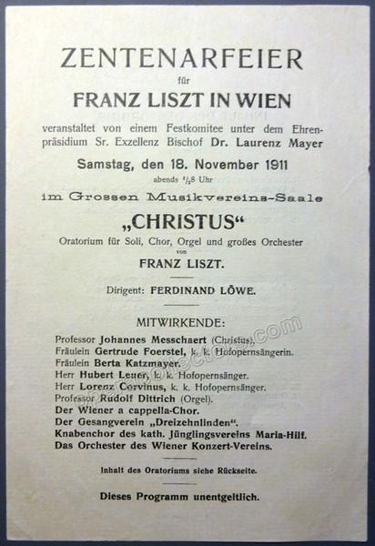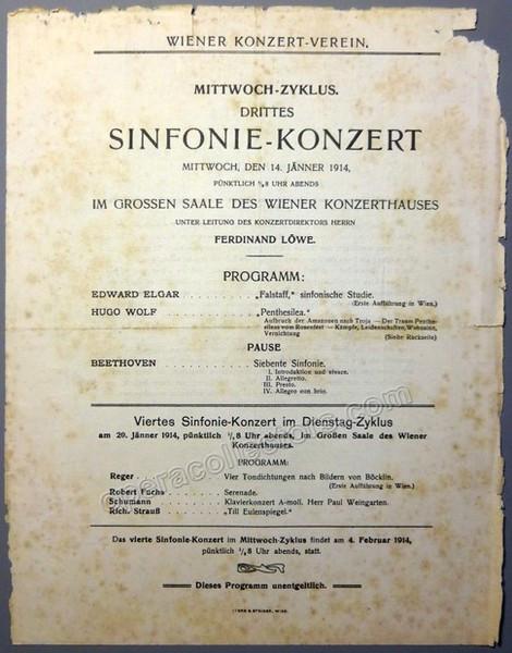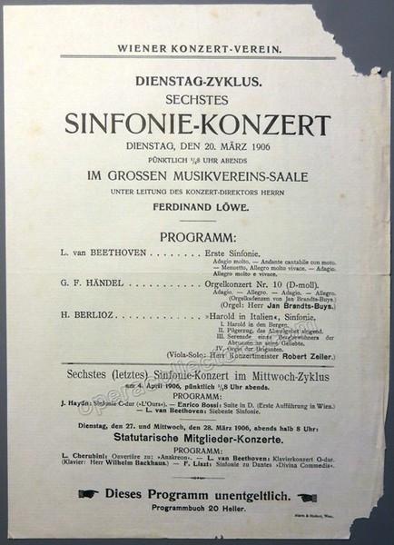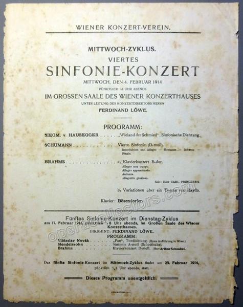 The 4 playbills are: Playbill Ferdinand Loewe conducting Vienna Symphony Orchestra , 4 February 1914. Von Hausegger, Schumann, Brahms. Pianist: Carl Friedberg. Playbill Ferdinand Loewe conducting Vienna Symphony Orchestra , 14 January 1914. Elgar, Wolf, Beethoven. Program Centenary Festival Franz Liszt Vienna. Fernand Loewe conducts Vienna Symphony Orchestra, 18 November 1911. Christus, oratorium - Franz Liszt. Playbill Ferdinand Loewe conducting Vienna Symphony Orchestra, 20 March 1906. Beethoven, Haendel, Berlioz. Organ: Jan Brandts-Buys. Sizes range from 5.5 x 8 inches to 9.25 x 11 inches