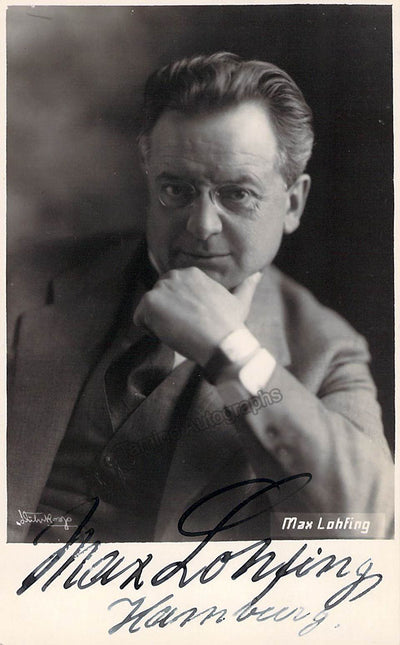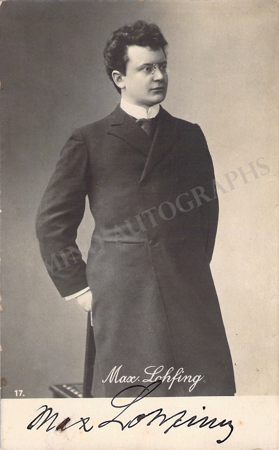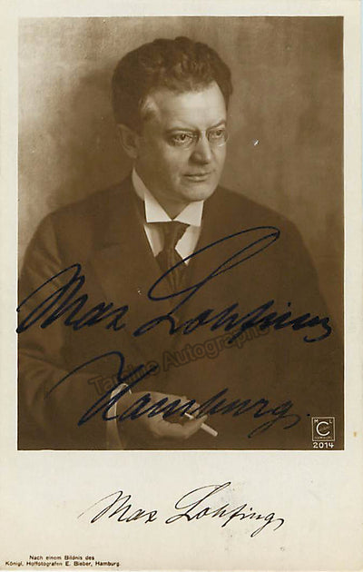 Signed postcard photograph, shown as himself, signed in Hamburg. Stamped on verso by photographer Minya Duhrkoop, Hamburg. Size is 3.25 x 5.25 inches, in excellent condition.