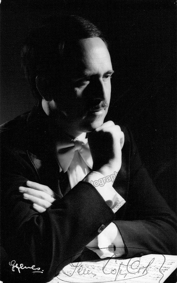 Spanish conductor (1940-2018). Fine black-and-white photograph signed by him, also handsigned on front and stamped on verso by photographer Gyenes, Madrid. Size is 3.5 x 5.5 inches, very slight paper loss on some corners, otherwise in excellent condition.