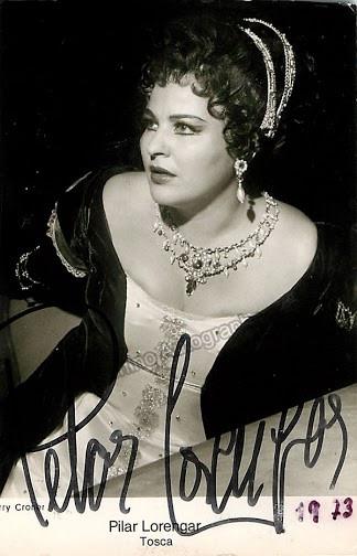 Signed photo postcard of the Spanish soprano (1928-1996) shown in the title role of Puccini's Tosca, dated in 1973. Size 3.5 x 5.5 inches