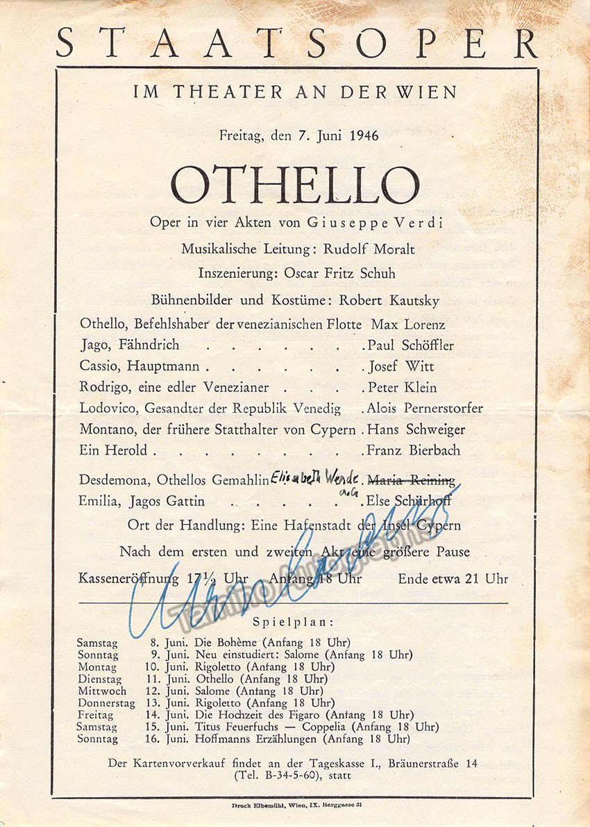 Program for a performance of Otello at the Vienna Staatsoper, June 7th, 1946. Conductor: Rudolf Moralt. Among the cast: Max Lorenz - Paul Schoffler - Peter Klein. Size is 15 x 21 cm, 1 page, signed by Lorenz on the front.