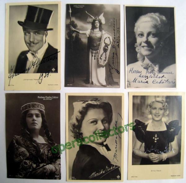 Lot of 6 signed photo postcards from the following signers: Maria Cebotari (1910-1949), Erna Sack (1898-1972), Johannes Heesters (born 1903, now 104 years old and still singing!), Julia Claussen (1879-1941), Charles Cahier (1870-1951) and Marika Rokk (1913-2004). All signed, sized 3.5 x 5.5 inches approx., in great condition. Excellent lot!