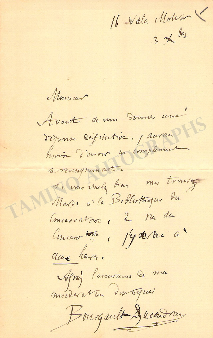 Bourgault-Ducoudray, Louis-Albert - Set of 2 Autograph Letters Signed Bourgault-Ducoudray, Louis-Albert - Set of 2 Autograph Letters Signed Bourgault-Ducoudray, Louis-Albert - Set of 2 Autograph Letters Signed