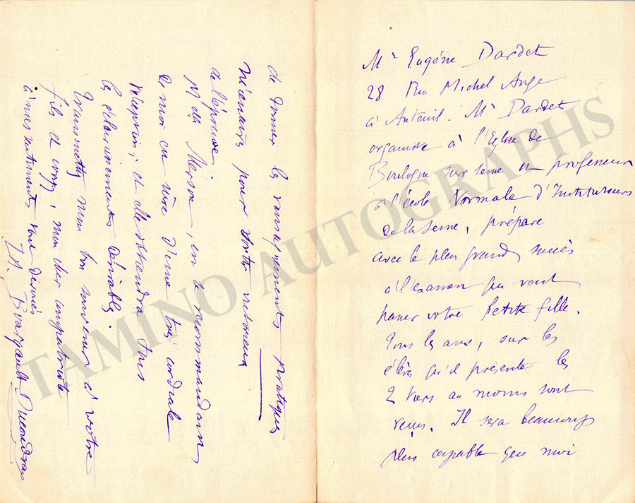 A. Dated May 23, to Monsieur Mersin, concerning the admission test for singers. Size is 4.3 x 6.7 inches each page, 3 written pages, folds, age-toning, in very good condition.
