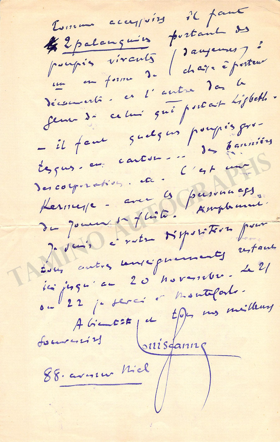 Autograph letter in French signed by him (dated ca. 1910) to the painter Alphonse Visconti about business. Size is 5.2 x 8.3 inches, 2 written pages, central fold, letterhead, in very good condition.