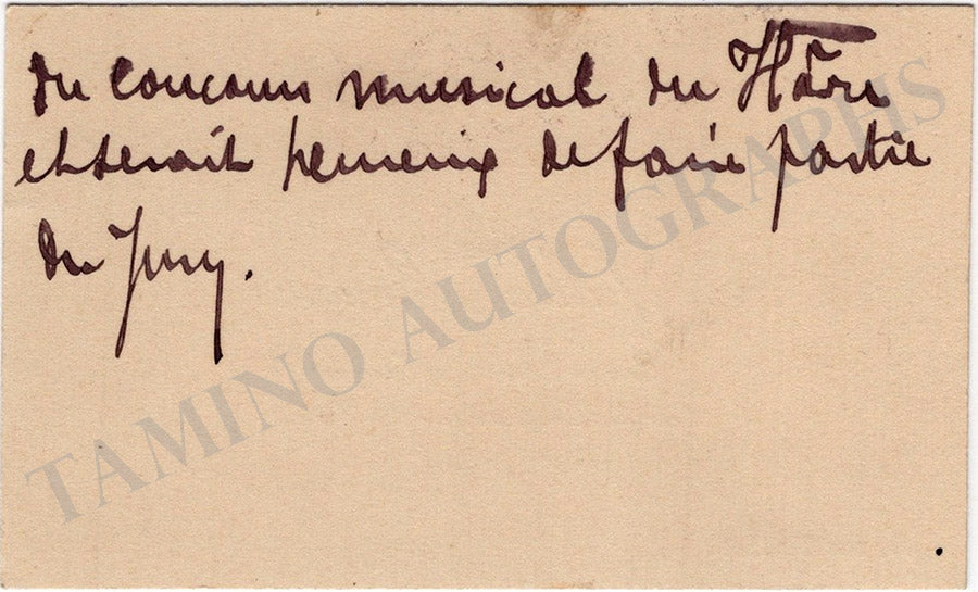 Short autograph note in French signed by him on his visiting card. Size is 3.8 x 2.3 inches, some dirt stains, in very good condition.