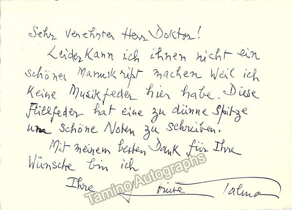 Autograph note in German (untranslated) on a card signed by her. Size is 5.75 x 4.1 inches, in excellent condition.