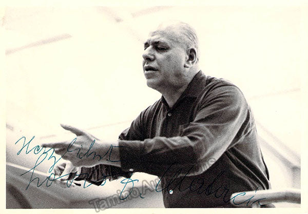 Black-and-white photograph signed by him with a short sentiment, shown in rehearsal; ink-stamped on verso by photographer Jean Waldis. Size is 5.6 x 3.9 inches, in excellent condition.
