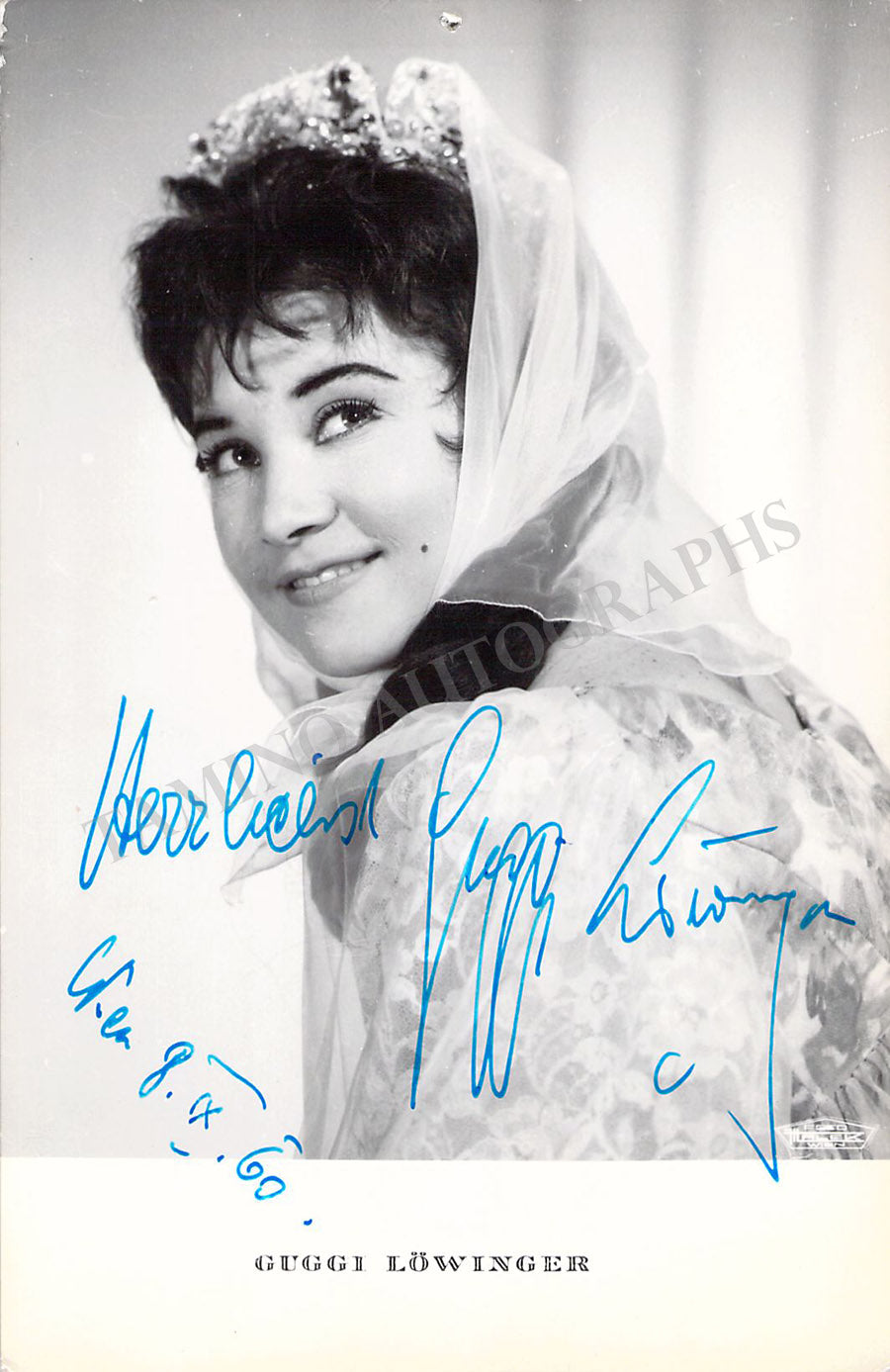 Austrian singer and actress (1939-2018), signed publicity photo postcard, shown most likely in role, dated in Vienna in 1960. Also contains printed photographer signature on front. Size is 3.5 x 5.5 inches, mounting tape traces on verso, otherwise in excellent condition.
