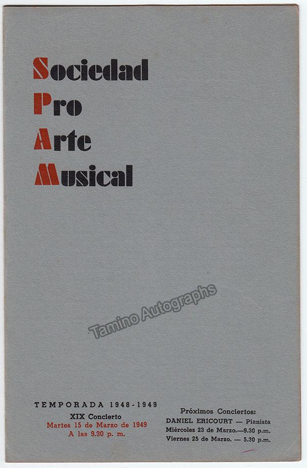 Program for a concert at Sociedad ProArte Musical, Havana, 1949, signed by the piano duo. Full program with all pages and covers. Size is 5.5 x 8.5 inches, in excellent condition.