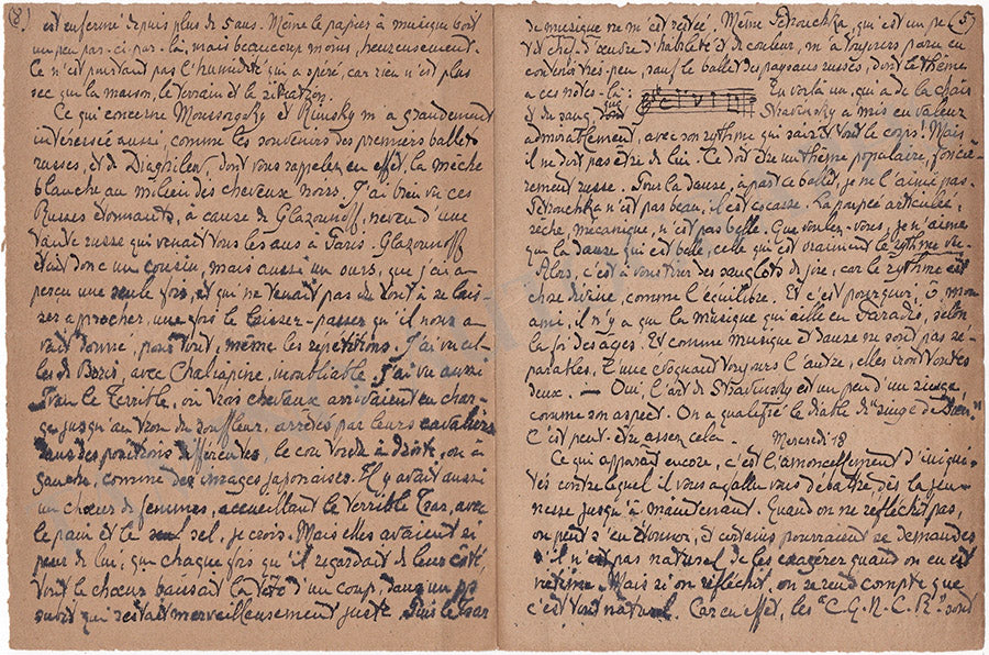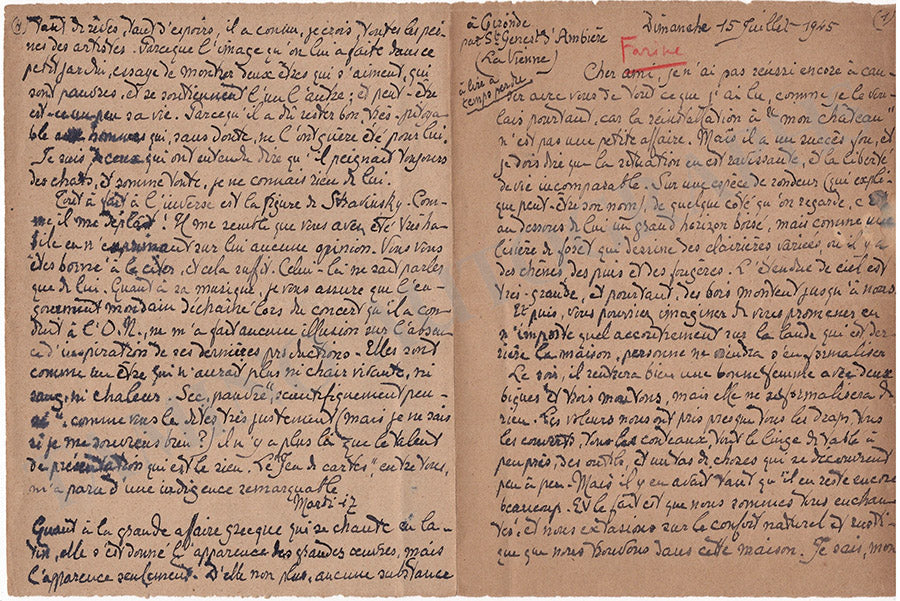 Interesting and lengthy autograph letter in French signed by him, with a brief autograph musical quotation signed by him, dated in Gironde par St. Genest d’Ambière from the 15th to the 20th of July, 1945.