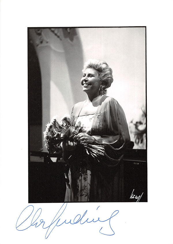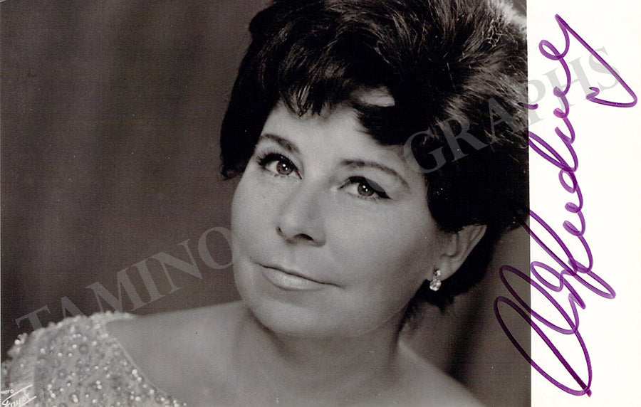 Signed postcard photograph, shown in role (most likely Dorabella in Mozart's Cosi Fan Tutte with Elizabeth Schwarzkopf as Fiordiligi). Photo by Ellinger, Salzburg. Size is 4 x 5.75 inches, in excellent condition.