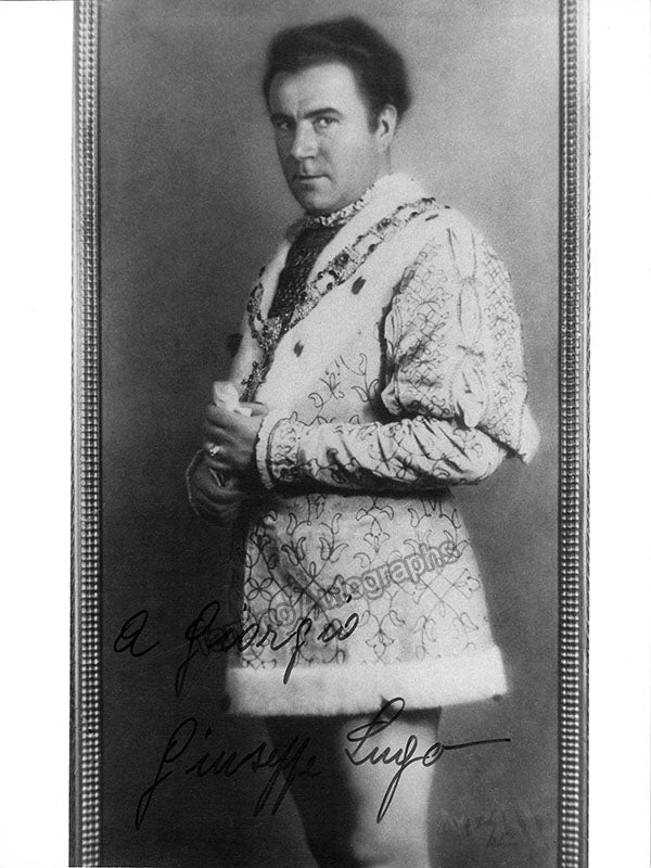Signed postcard photograph, shown as Rodolfo in Puccini's La Boheme, inscribed. Photo by Ancillotti and Martinotti photographers, La Scala, Milan. Size is 4 x 5.75 inches, small creases on edges, otherwise in excellent condition.