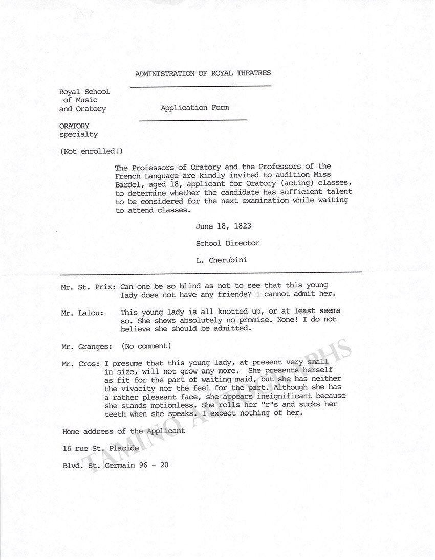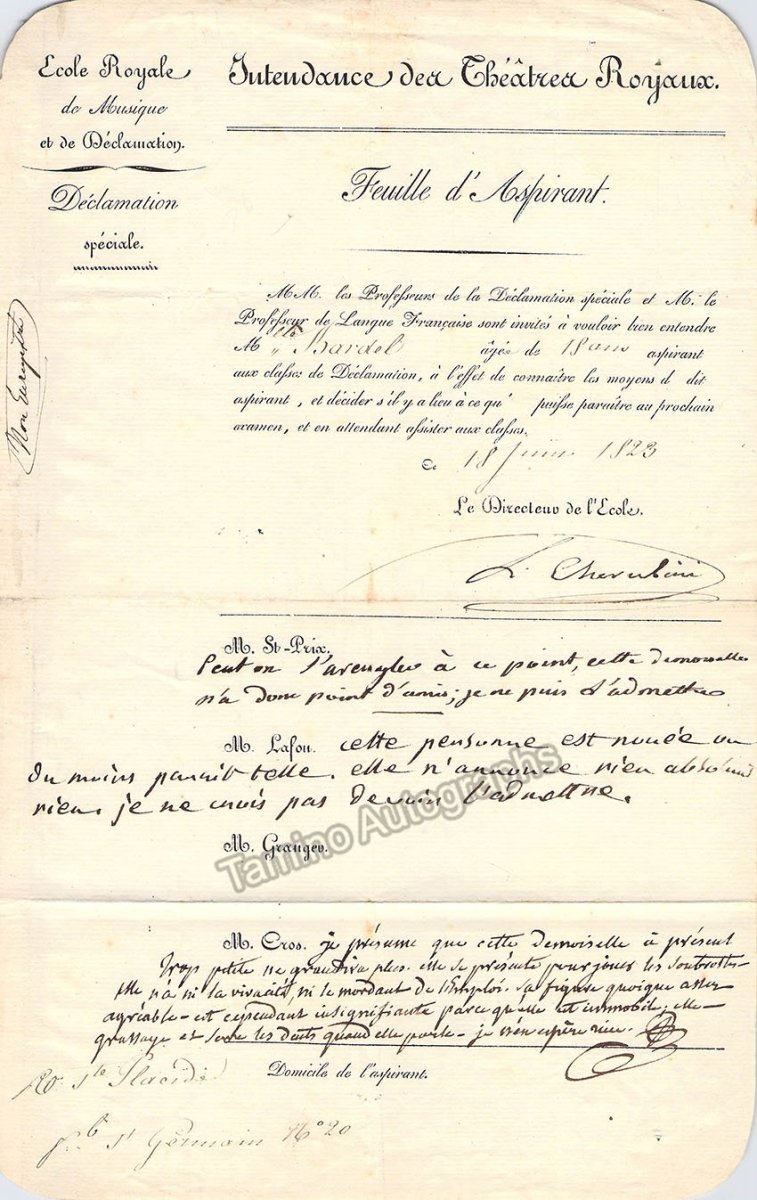 Signed printed form from the Royal School of Music at Paris, inviting other professors to an audition, written in French, dated in 1823.  Cherubini signs under the top printed part, while other professors responded below.  Size is 7.75 x 12.25 inches, 1 page, rounded edges, folds, minor stains, in very good condition.