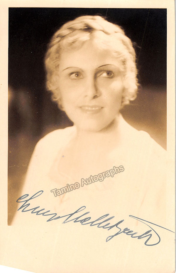 Black-and-white photo postcard signed by her, shown as herself. Size is 3.4 x 5.25 inches, ink writing on the back, otherwise in excellent condition.