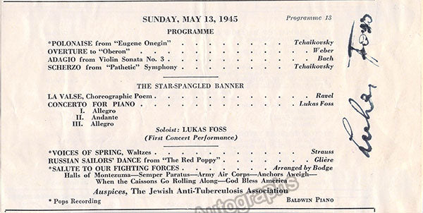 Clip from a program for a concert on May 13, 1945, no place indicated, for a performance of works by the American composer Lukas Foss, with himself as soloist.