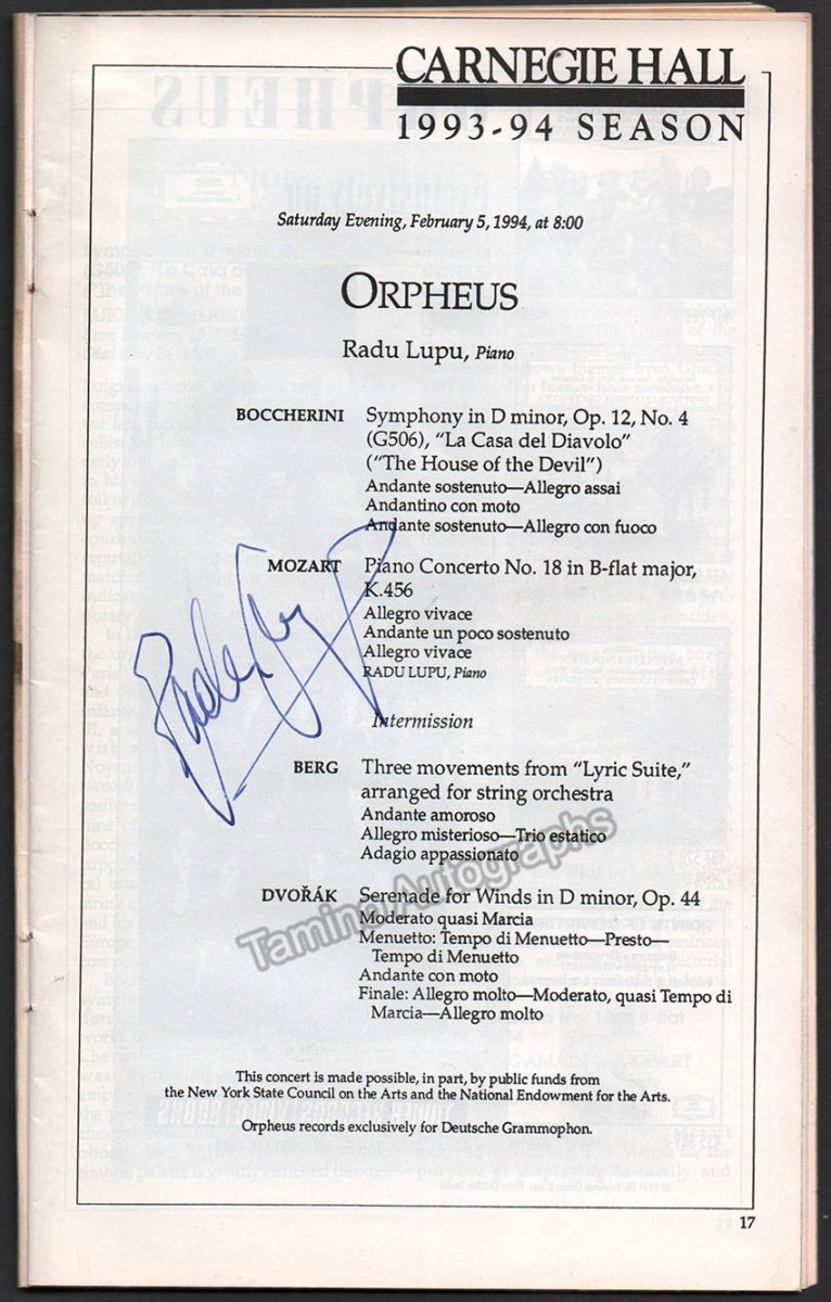 Lupu, Radu - Signed Program Carnegie Hall 1994