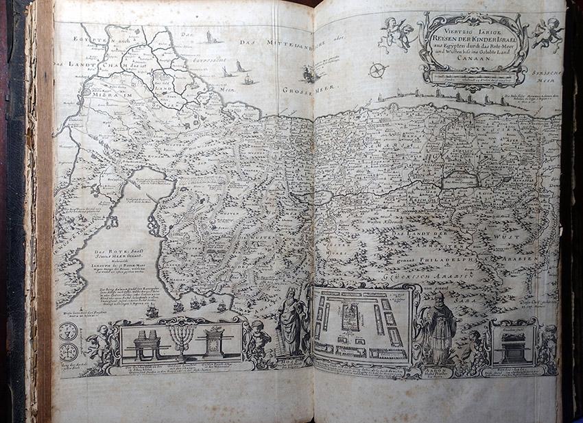 Fantastic, large volume bound in leather with original brass mounts, including 5 double-page folding engraved maps (double-hemispheric world map after Nicolaas Visscher, 3 maps of the Holy Land, 1 of the itinerary of the Apostles). Four parts into one large volume, 10.75 x 16.5 inches, complete with 356 pages plus covers - a rare find with the original brass mounts on the cover corners, some pages show rust and cracks, overall in very good condition. See pictures.