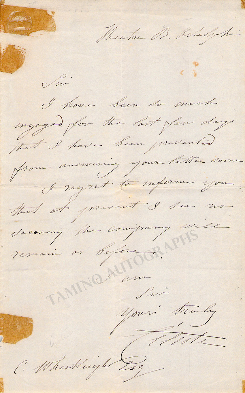 Autograph letter signed by her and dated 1859, about professional engagements. Size is 4.5 x 7.2 inches, 1 page, rust stain over the left border, in overall very good condition.