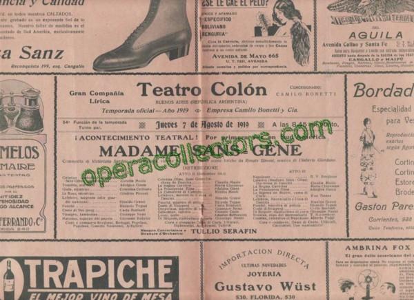 MADAME SANS-GENE - August 7th, 1919. Teatro Colon program with Claudia Muzio. Conductor: Tullio Serafin. First time ever performance in South America of this opera by Umberto Giordano