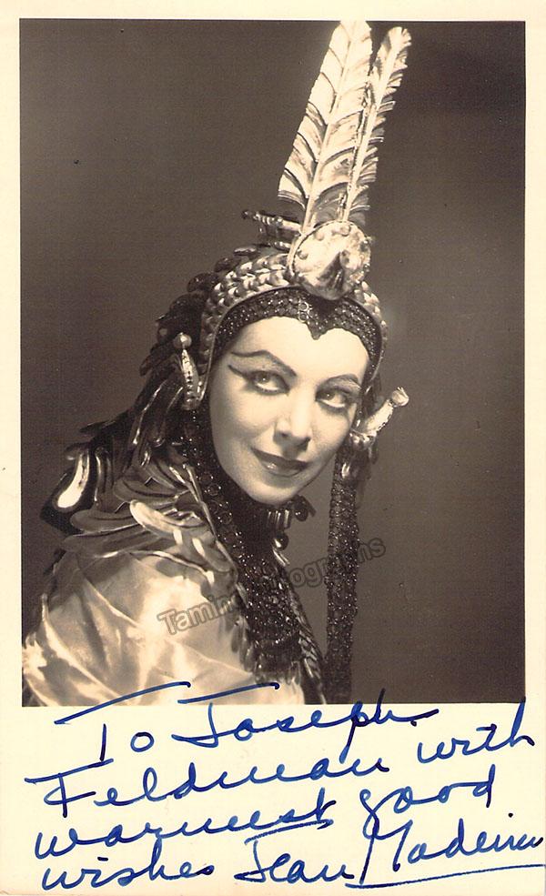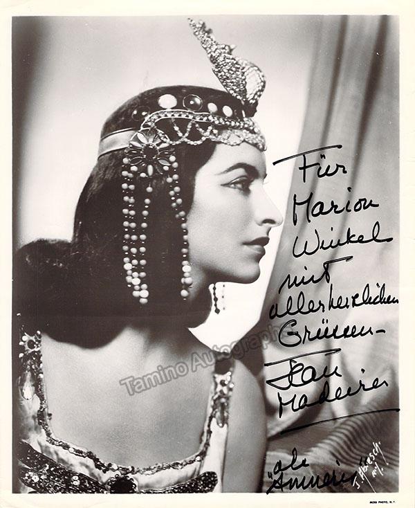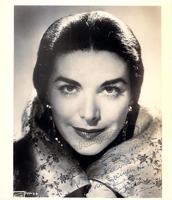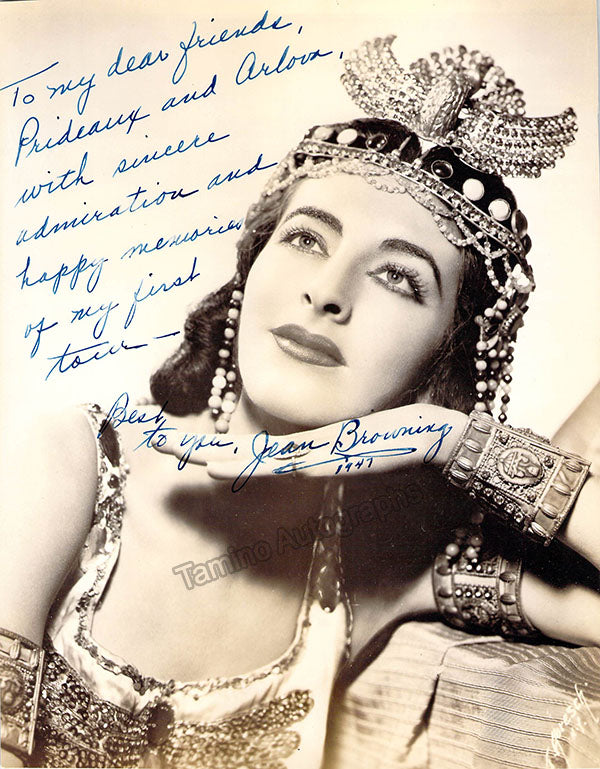 Signed photograph, shown as Amneris in Verdi's Aida, signed with her birth name 'Jean Browning' and extensively inscribed, dated in 1947. Printed signature on front of photographer J. Abresch, New York. Size is 7.25 x 9.25 inches, in excellent condition.