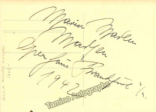German soprano (1905-1990), theater and television actress.  Signed photo postcard shown as herself, signed on front with additional signature on verso, signed in Frankfurt, dated in 1942. Size is 4 x 5.75 inches, in excellent condition.