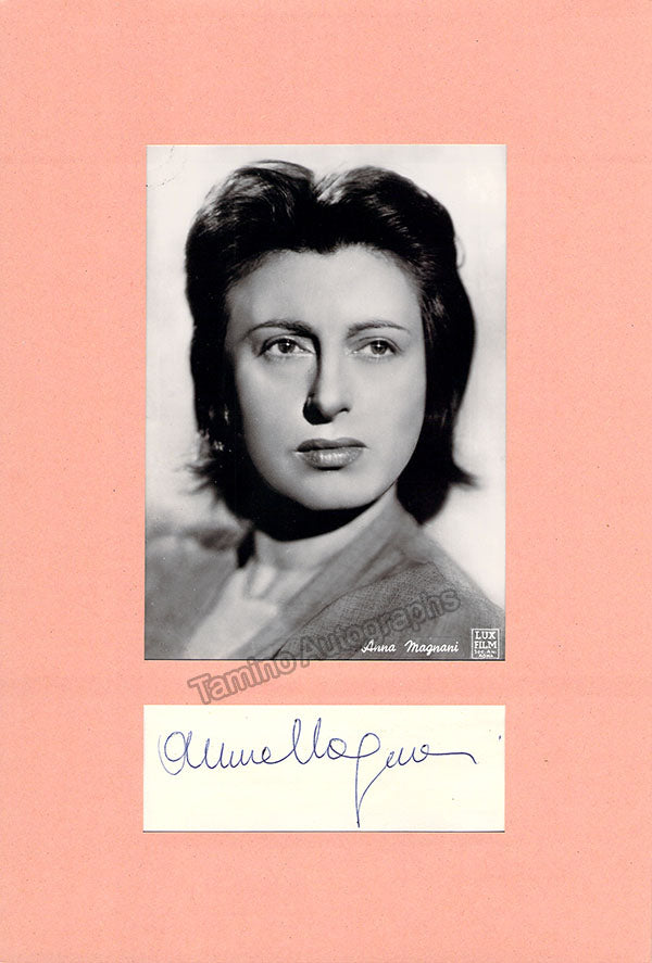 Set of one 4 x 5.75 inch photograph, shown as herself, a photo by Lux Film studios, Rome mounted onto soft cardboard with her signature on a 1.25 x 3.75 inch signed album page in another window just below.  Total item size is 7 x 10.5 inches, in excellent condition.