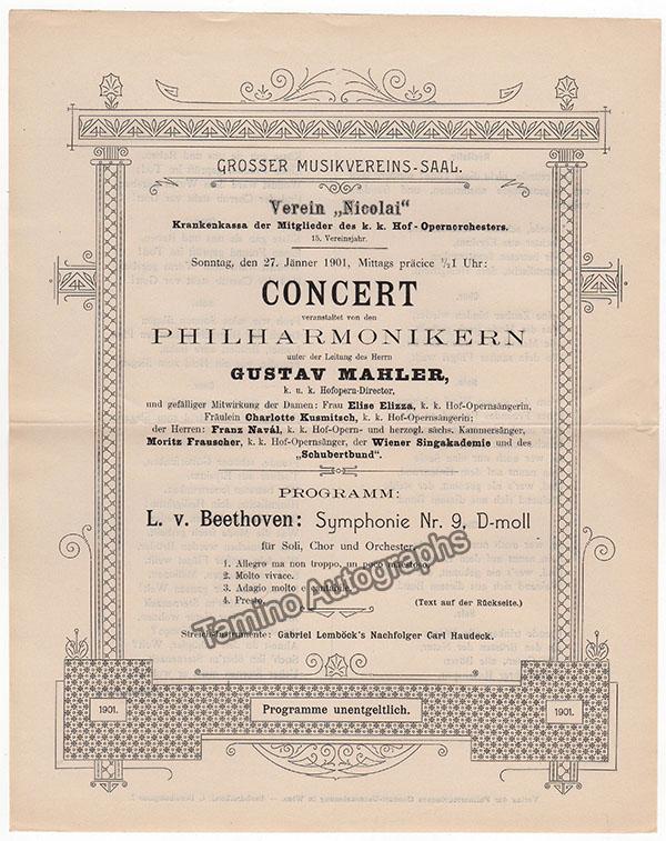 Playbill announcement for a performance of Beethoven's 9th Symphony at the Grosser Musikvereins-saal in Vienna on January 27th, 1901, with the Vienna Philharmonic Orchestra conducted by the Austrian conductor and composer.  Size is 9.3 x 11.75 inches, 1 page, lyrics printed on verso, central fold, in excellent condition.