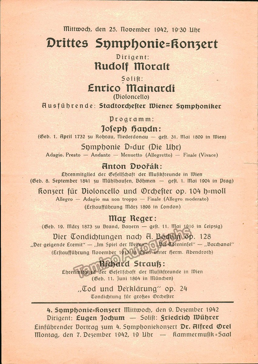 Program for a concert on Nov 23rd, 1942, Vienna, with Enrico Mainardi as soloist, Hans Knappertsbusch conducting the Vienna State Orchestra. Full program, 5.75 x 8.25 inches, excellent condition.