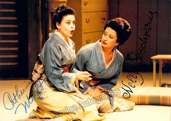 American soprano (b. 1948) and Bulgarian mezzo-soprano (b. 1949), double-signed photograph, shown in roles in Puccini's Madama Butterfly. Size is 5 x 7 inches, in excellent condition.
