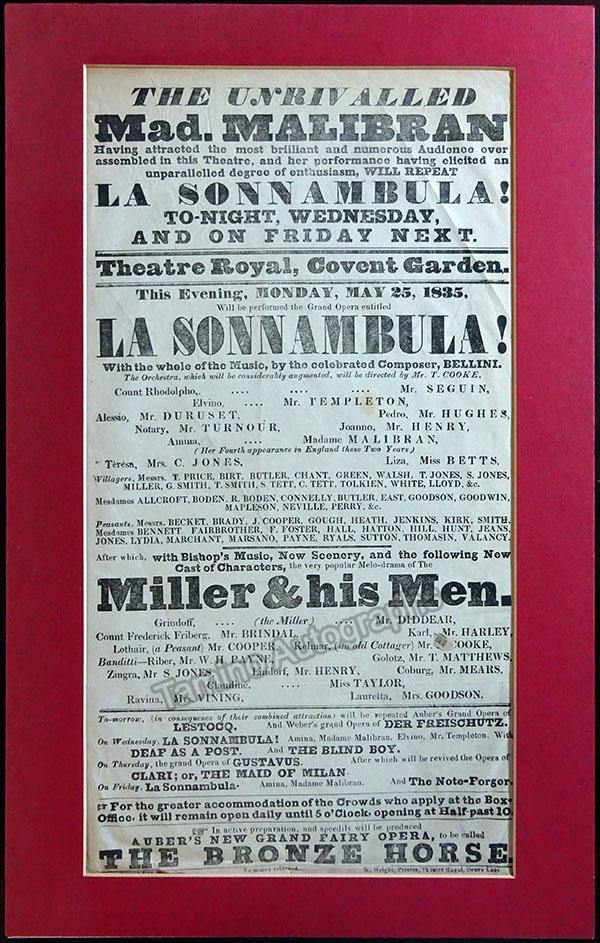 Famous French-born mezzo-soprano (1808-1836), one of the greatest singers in her time who died at age 28. Playbill mounted on a mat, for a performance of Bellini's La Sonnambula at the Theatre Royale, Covent Garden, London, 1835.  Total size is 9.9 x 15.3 inches, playbill is 8.4 x 13.5 inches, in very good condition.