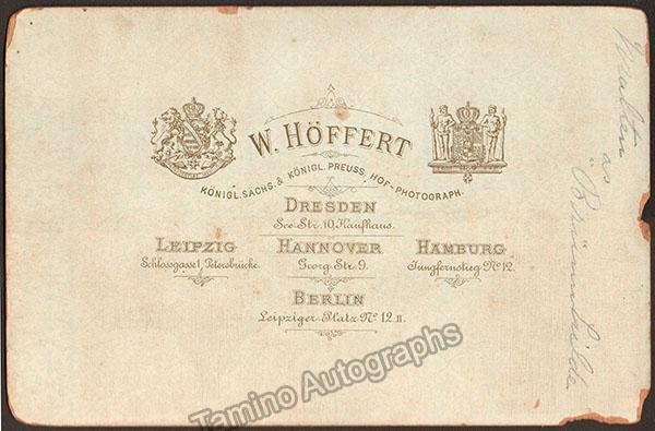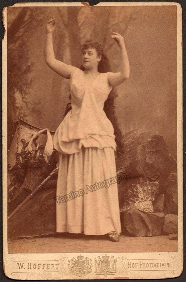 German soprano (1853-1930) shown as Brunnhilde in Wagner's Der Ring des Nibelungen. Unsigned cabinet photo by photographer W. Höffert, Dresden. Size is 4.25 x 6.5 inches, small loss of paper over upper left corner, otherwise in very good condition.