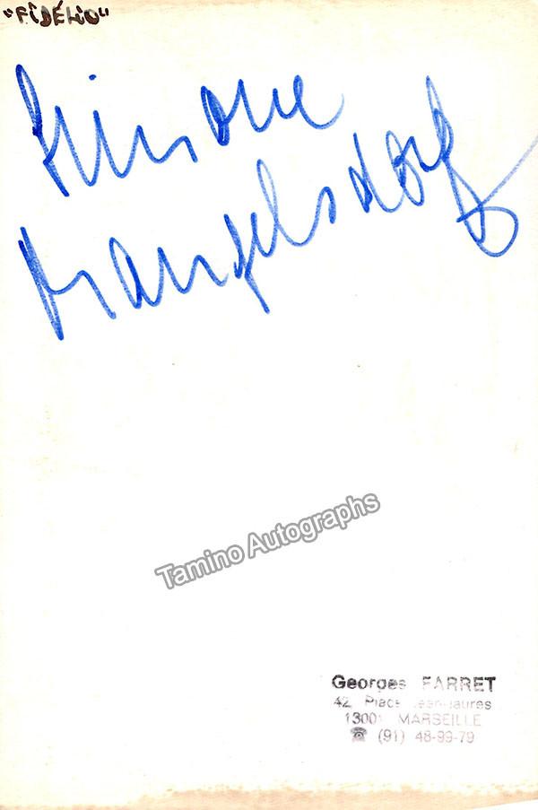 German soprano (1931-1973), signed photo, shown in the title role in Fidelio. Size is 4 x 6 inches, signature is on verso.