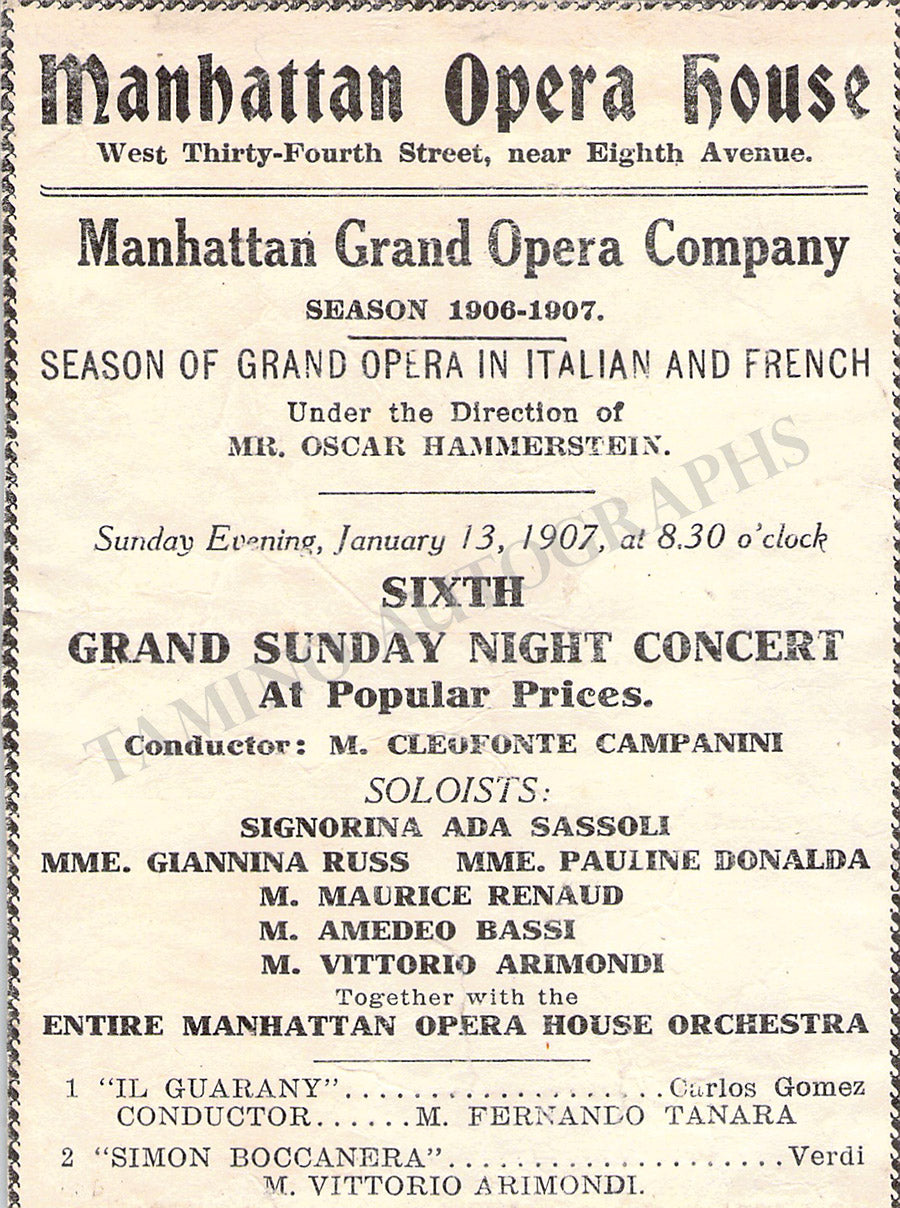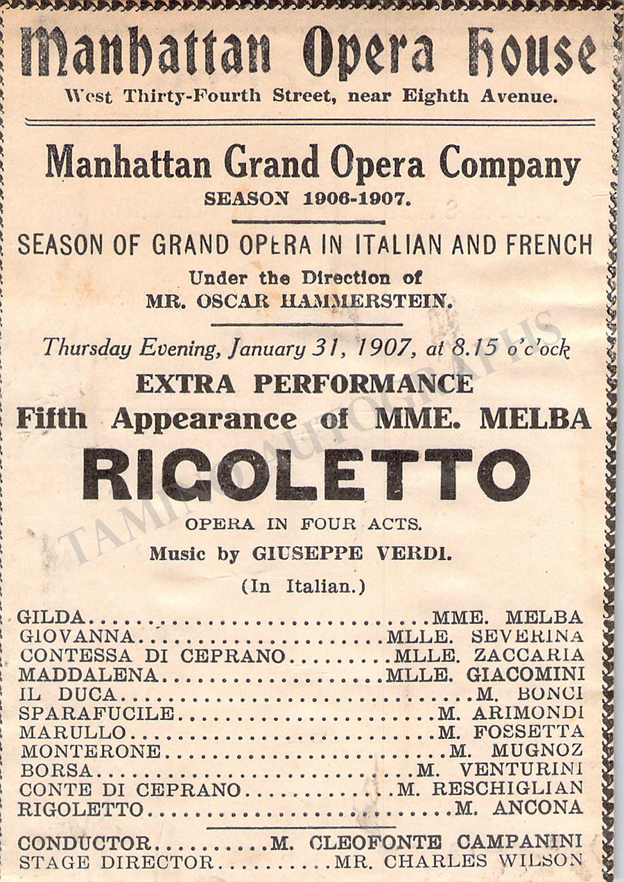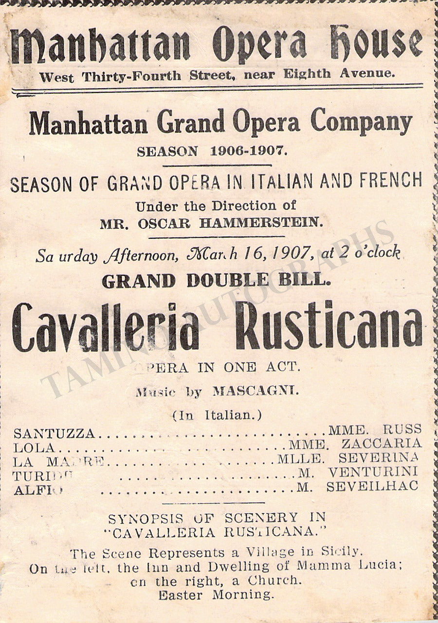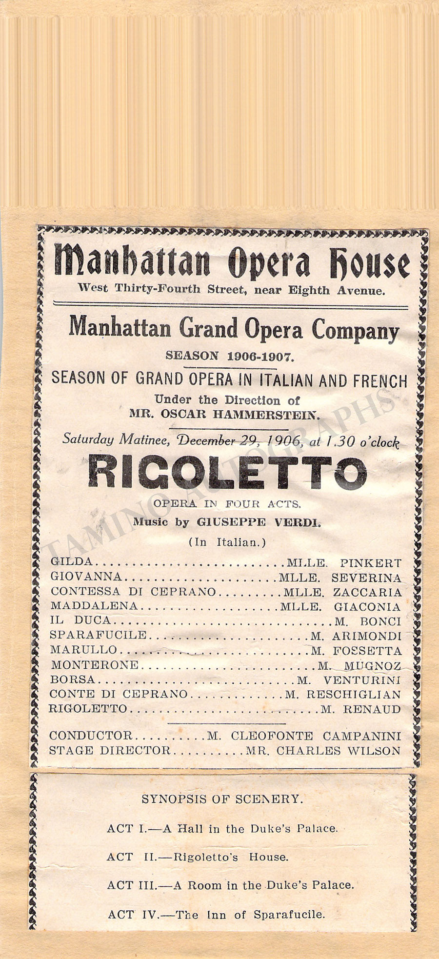 Collection of clips from programs (NOT COMPLETE PROGRAMS) for performances at the Manhattan Opera Company, plus some announcements of upcoming performances. Various sizes, all in very good condition.