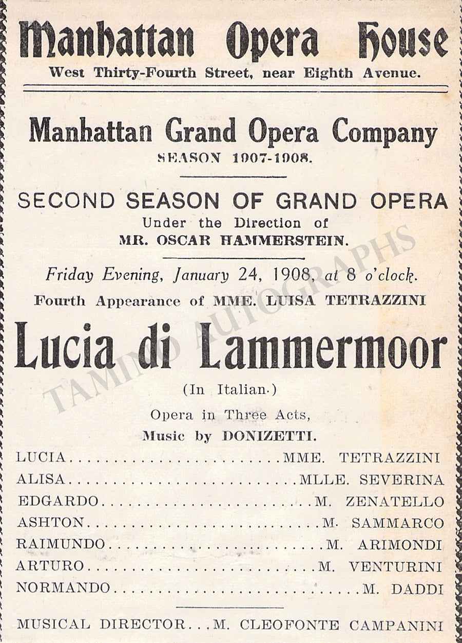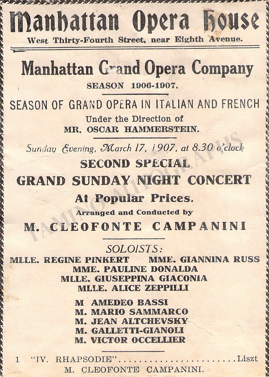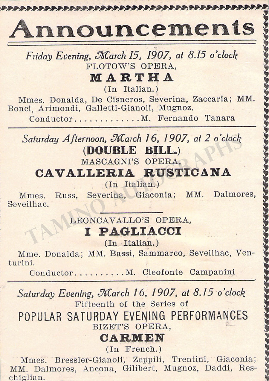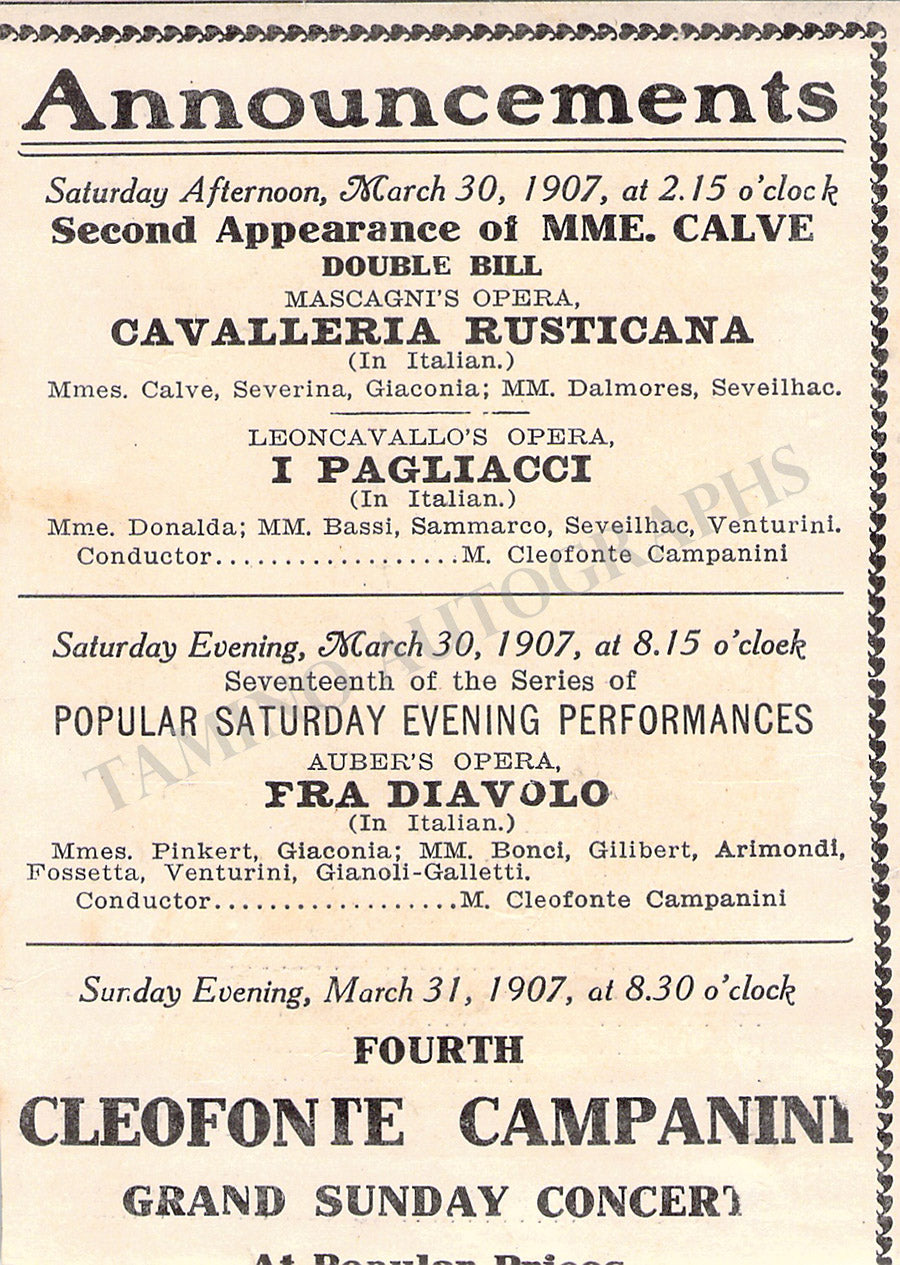Collection of clips from programs (NOT COMPLETE PROGRAMS) for performances at the Manhattan Opera Company, plus some announcements of upcoming performances. Various sizes, all in very good condition.