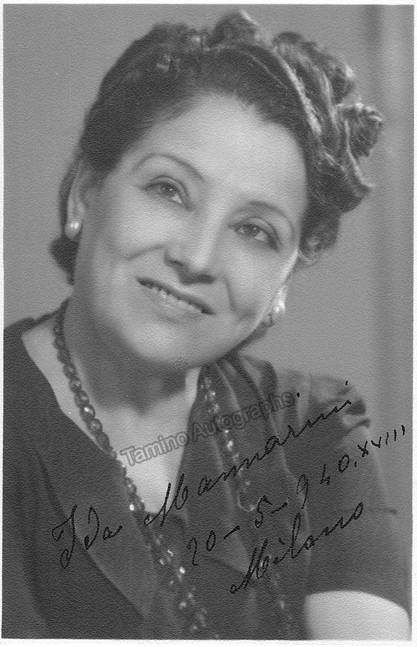 Italian mezzo (1885-1972), signed photo, shown as herself. Signed in Milan, dated 1940. Stamped on verso by photo studio "Il Giglio", Rome. Size is 3.75 x 5.75 inches, in excellent condition.