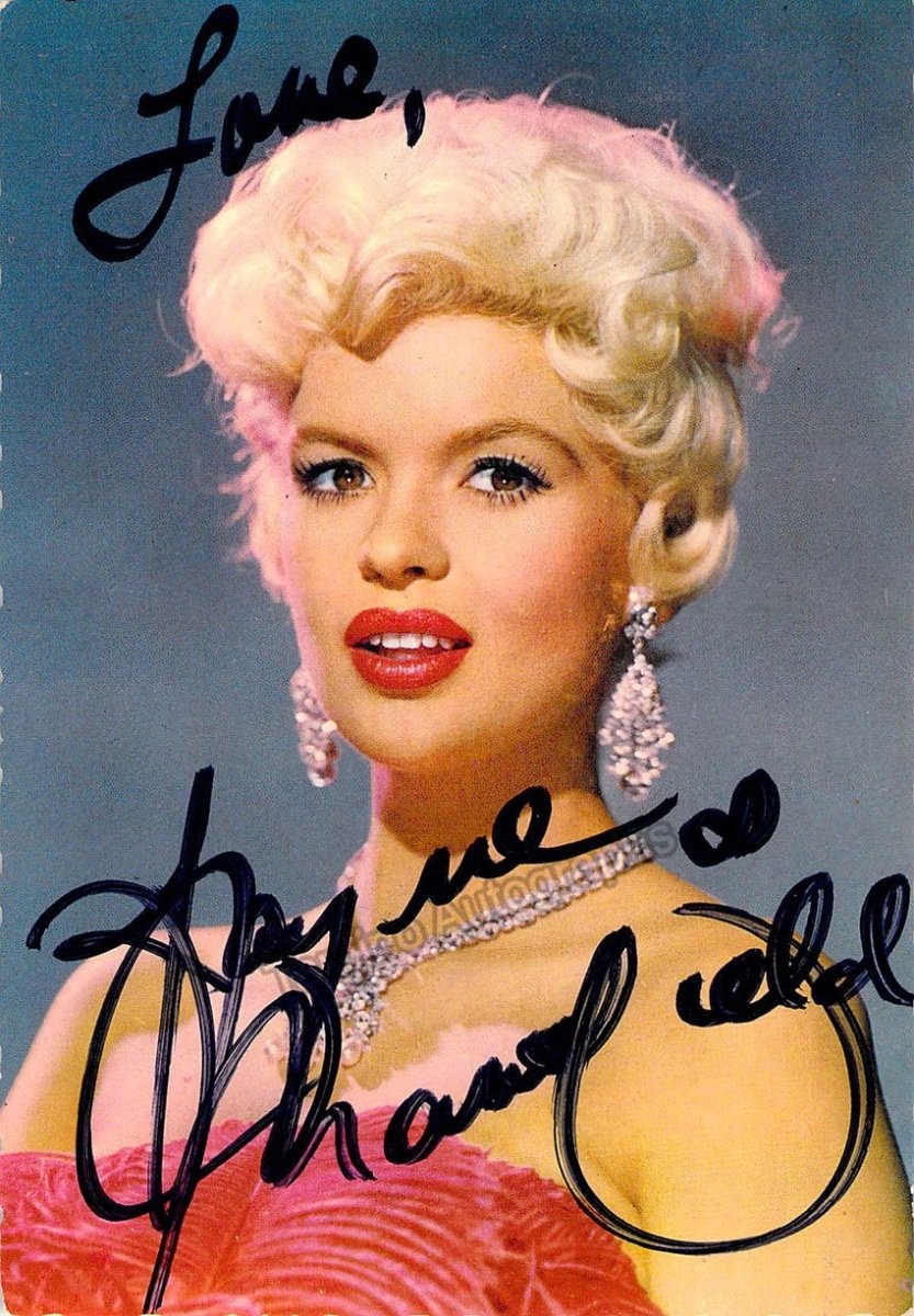 American film, theater and television actress (1933-1967) and a major Hollywood sex symbol during the 1950s and 1960s, active between 1954 and 1967. Signed photo postcard. Size is 4 x 5.75 inches, jagged edges, in excellent condition.