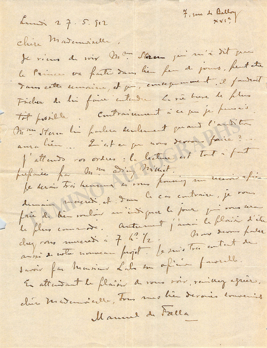 Autograph letter in French (sold untranslated) signed by the composer, dated in 1912. Size is 8 x 10.5 inches, 1 page, folds, in very good condition.