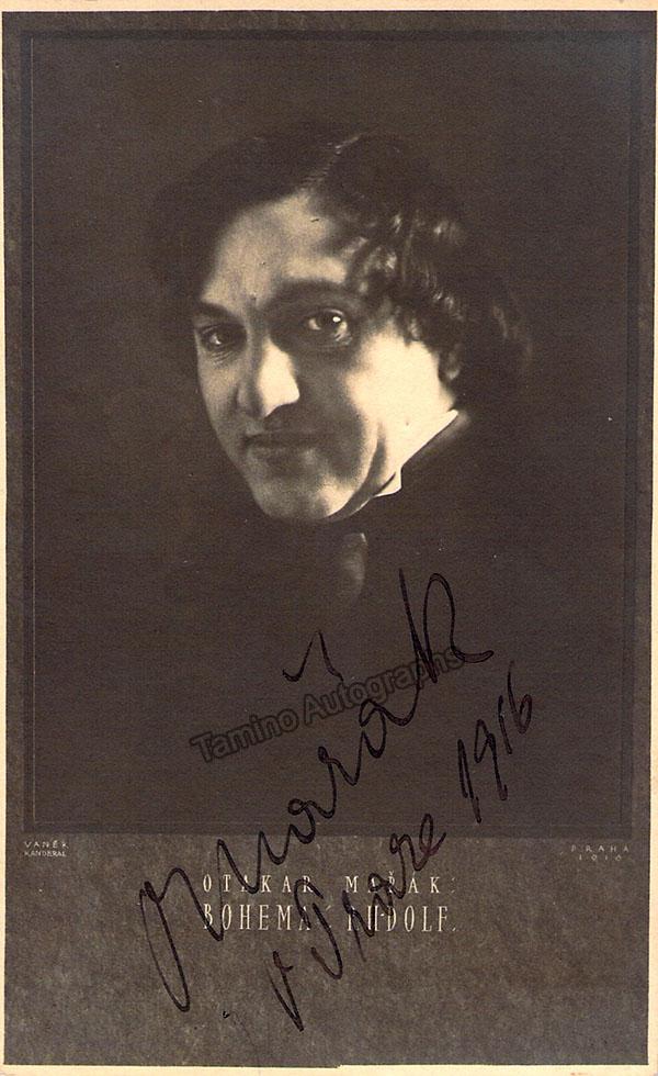 Czech tenor (1872-1939), signed photo postcard, shown as Rodolfo in Puccini's La Boheme, dated in 1916. Blind stamped by photographer Vanek Kanderal, Prague. Size is 3.5 x 5.5 inches, in excellent condition.