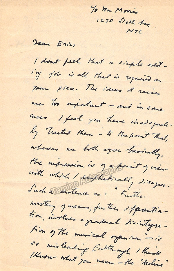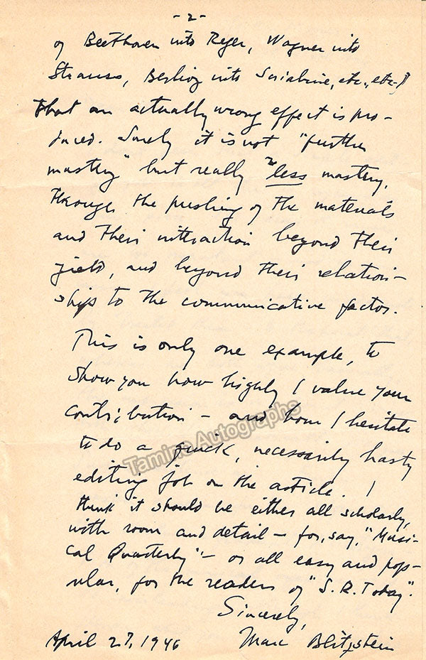 Autograph letter signed by him, dated April 27, 1946, about music matters. Size is 5.5 x 8.5 inches, 2 written pages (in two separate sheets), in excellent condition.