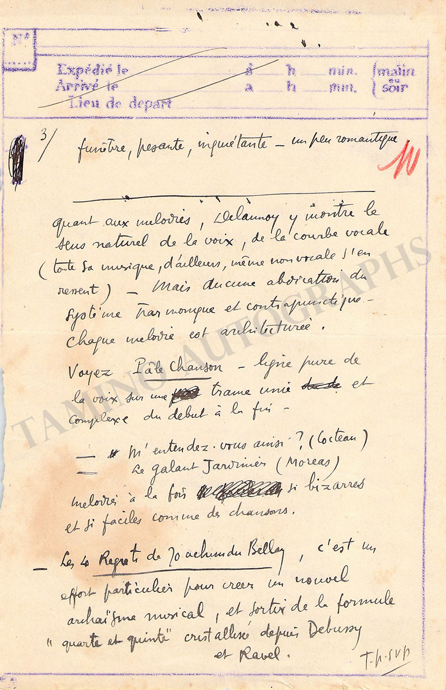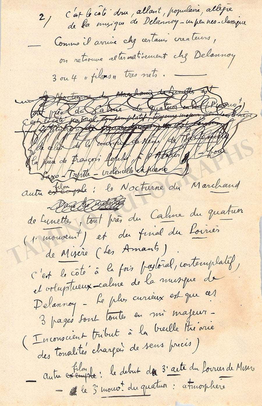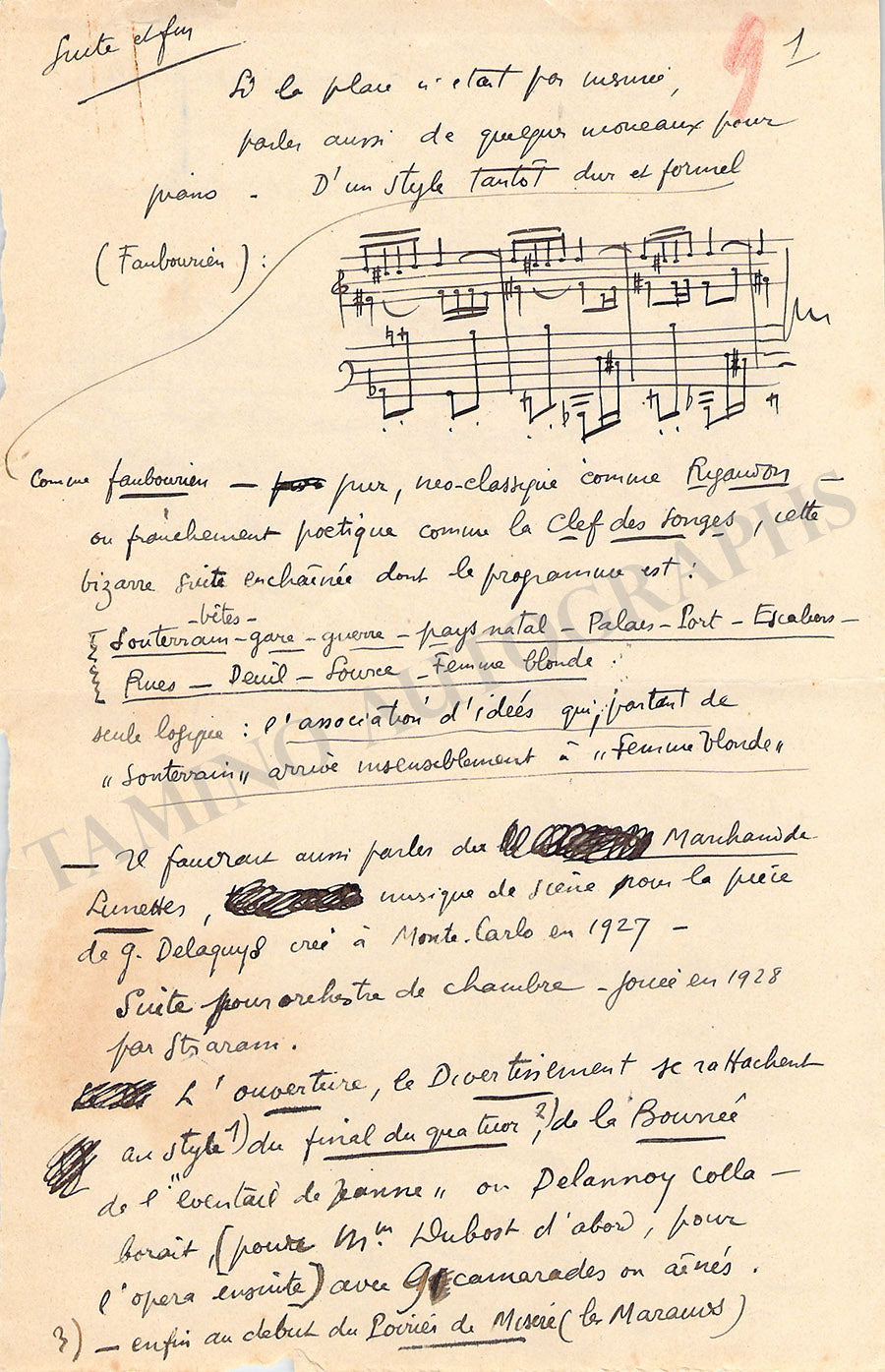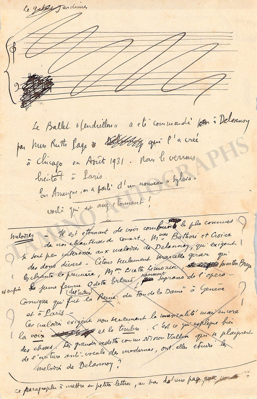 Autograph document by wich the French composer provides information on his activity and music works for an article to be written about him. The composer mentions his works ‘Rigaudon’, ‘Clef des Songes’, ‘Bourrée’, ’L’éventail de Jeanne’, ‘Poirier de Misère’, ‘Quatre Regrets de Joachim du Bellay’. Among the notes, draft corrections and rewritings Delannoy inscribes a few musical bars.