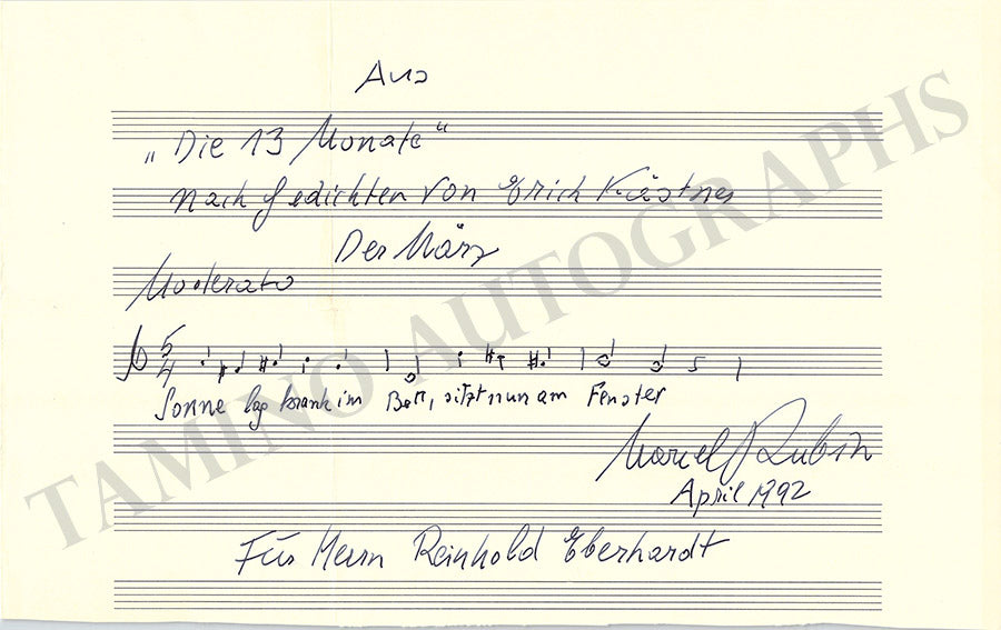 3-bar autograph music quote from his "Die 13 Monate" signed by him with a short text in German, dated 1992. Size is 10.6 x 6.5 inches, in excellent condition.
