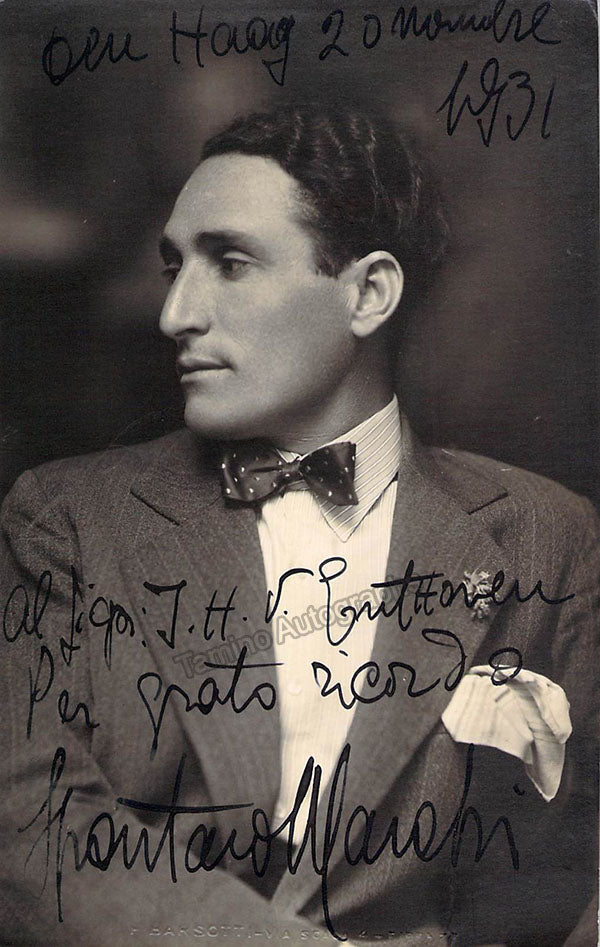 Italian baritone (1891-1976), signed postcard photograph, shown as himself, inscribed in the Hague, dated in 1931. Blind stamped on front by photographer F. Barsotti, Florence. Size is 3 x 5 inches, some silvering, otherwise in excellent condition.