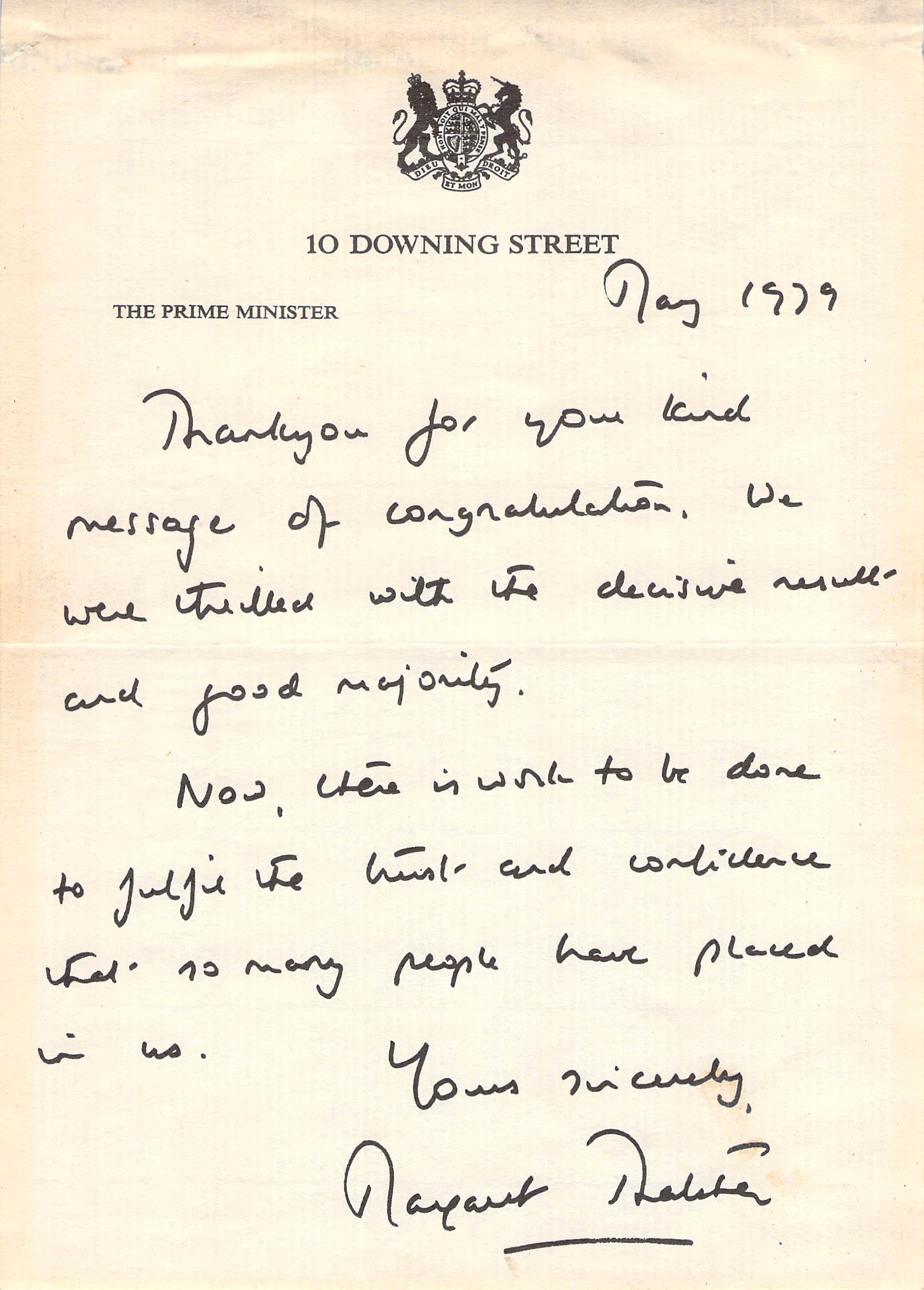 Autograph note signed by her with letterhead from 10 Downing Street, dated May 1979. Size is 5.8 x 8.25 inches, 1 page, in excellent condition.