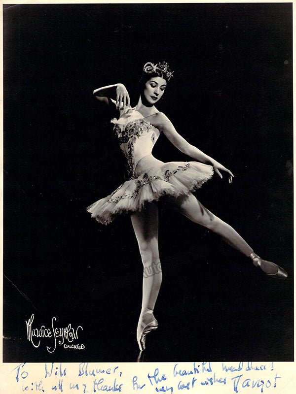Beautiful black-and-white photograph signed by her as 'Margot' and inscribed with a short sentiment; a photo by Maurice Seymour (Chicago). Size is 6.25 x 8.25 inches, ink markings on verso indicate London, 1951, in very good condition.