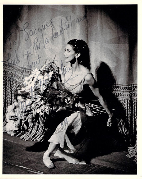 Fine black-and-white half-tone photograph signed by her, shown next to Rudolf Nureyev. Size is 8.6 x 11.1 inches, in excellent condition.