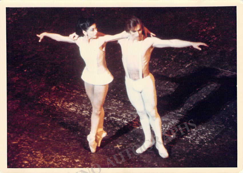 Set of 5 unsigned photographs featuring the two star ballet dancers shown in "Paradise Lost". Two color photographs are 7 x 4.9 inches in size, two black-and-white photographs are 9 x 7.1 inches, ink-stamped on verso by photographer John Blomfield (London); 1 black-and-white photograph ink-stamped on verso by photographer Judy Cameron (New York), size is 8 x 9.9 inches.