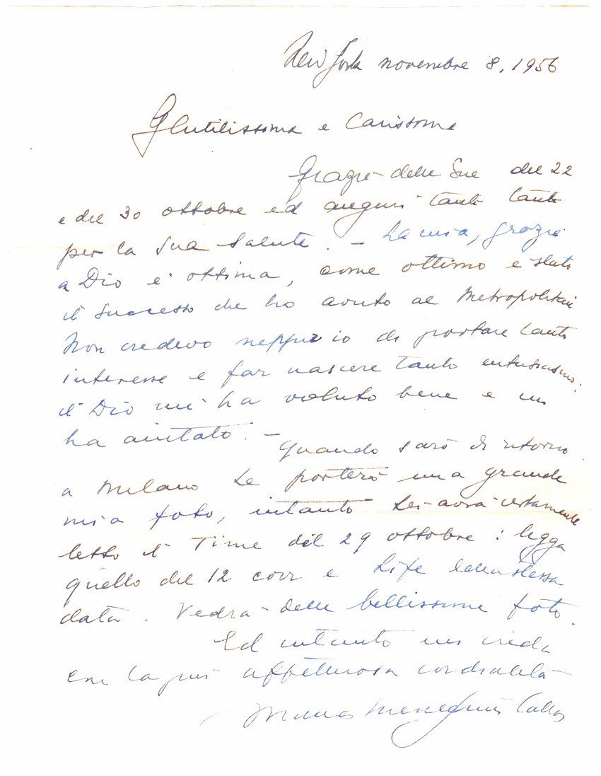 Important letter handwritten by Giovanni Meneghini, her first husband, dictated by her, to a fan, mentioning her huge success at the famous opening night of the Metropolitan Opera on October 30th, 1956. One page, in Italian, 8.5 x 11 inches, in excellent condition.