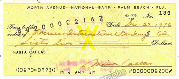 Check handwritten and signed by the diva, for usd 62, from the Worth Avenue National Bank, dated in December 1976. Size is 6.25 x 2.75 inches, in excellent condition, will frame well with a good photo. A nice and affordable souvenir of Callas.