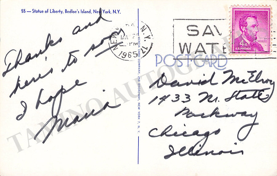 Regular postcard signed by her as "Maria" including a short greeting, no date (postal markings indicate the year 1965). Size is 5.5 x 3.5 inches, in excellent condition.